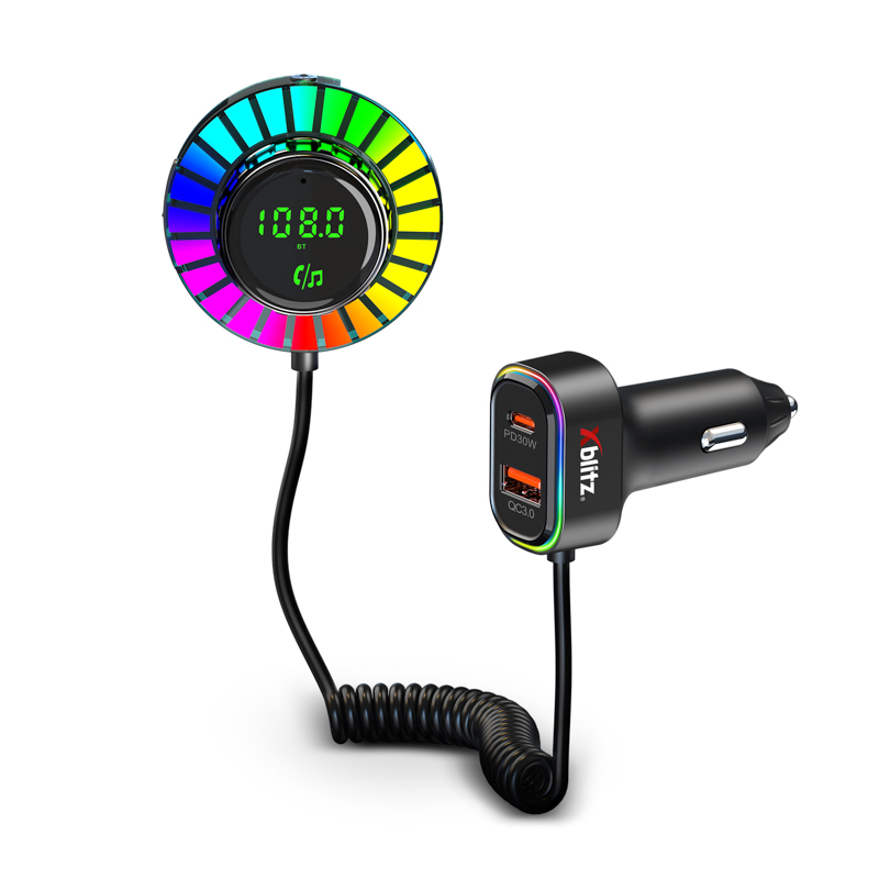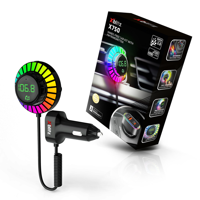 Xblitz X750 to transmiter FM, który bezprzewodowo przesyła muzykę i rozmowy telefoniczne z telefonu do systemu audio w samochodzie. Dzięki szerokiemu zakresowi częstotliwości (87,5 – 108,0 MHz) urządzenie zapewnia wyjątkową jakość dźwięku i jest kompatybilne z każdym samochodowym radiem.