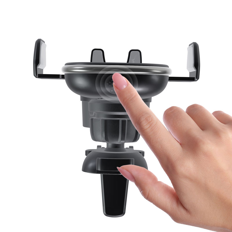 Ramiona uchwytu otworzą się, gdy tylko delikatnie dotkniesz tylną, górną część produktu, gdzie znajdują się delikatne wypustki i czujnik ruchu. Po zamieszczeniu smartfona, wystarczy, że ponownie dotniesz przedstawione miejsce i skrzydełka zamkną się, przytrzymując telefon.