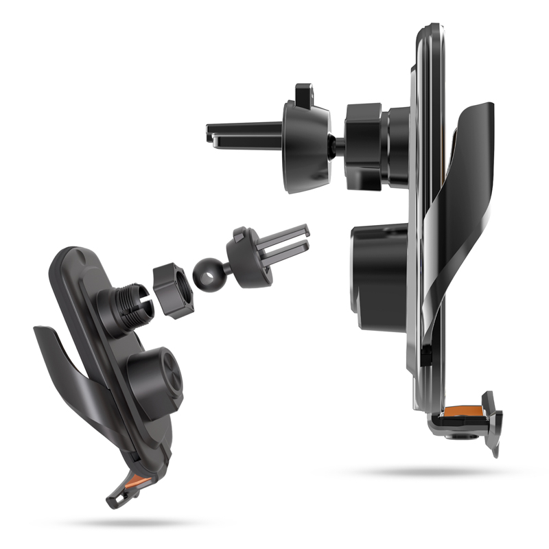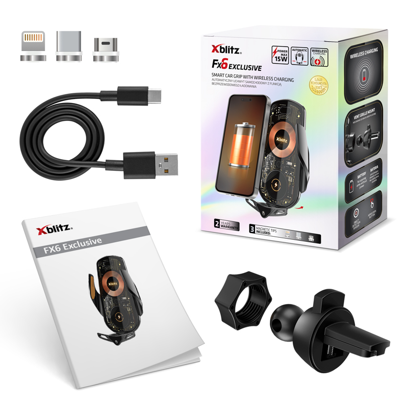 Xblitz FX6 Exclusive oferuje dwa sposoby ładowania – indukcyjne do 15 W i przewodowe z pomocą trzech magnetycznych końcówek dołączonych do zestawu. Automatyczne ramiona uchwytu reagują błyskawicznie na zbliżenie telefonu, a wbudowana bateria pozwala na ich otwarcie nawet bez zasilania. Minimalistyczna konstrukcja i surowe linie nadają mu nowoczesny, funkcjonalny charakter.